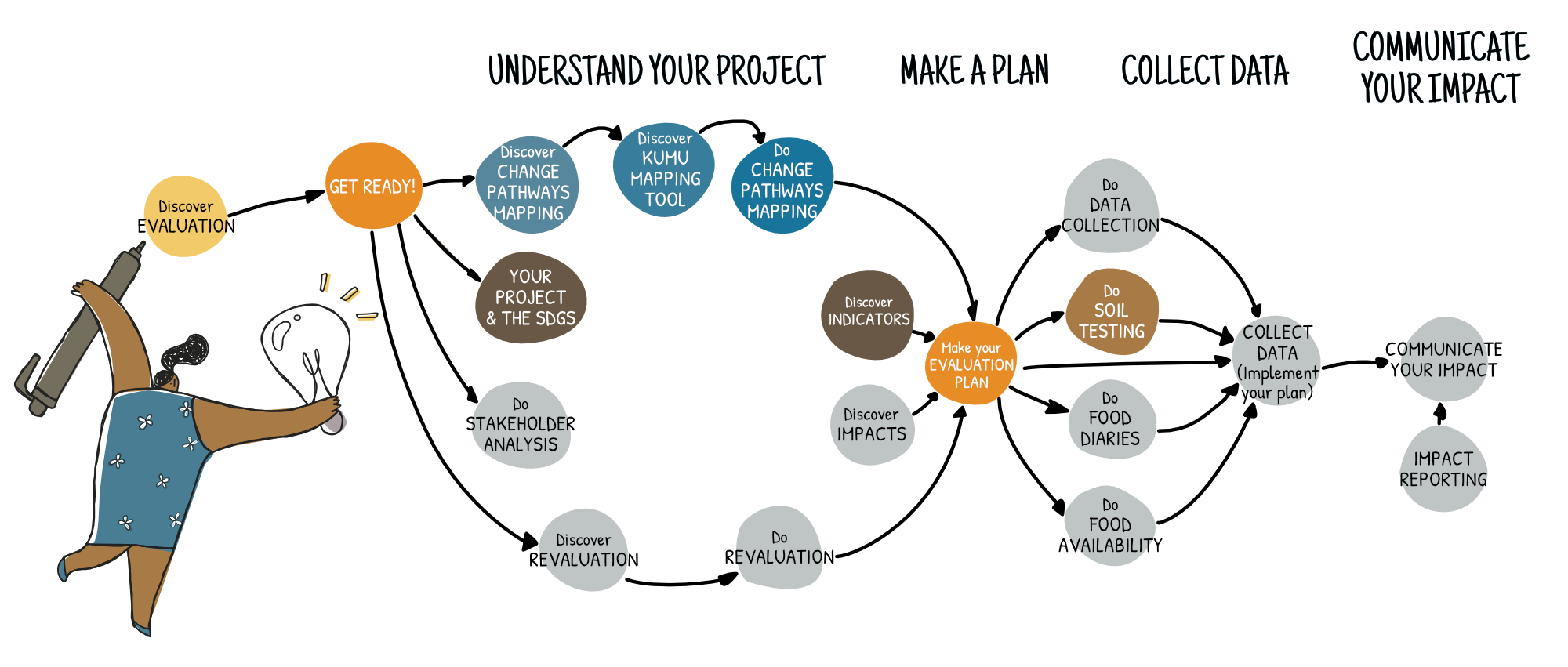 Using your data to understand your outcomes and communicate your impact is the last step in this process. Your journey might not end here though! Use your findings to improve your project, and continue to explore your impact (...back to step 1…)We are busy creating courses and mini-courses to help you with step 4: